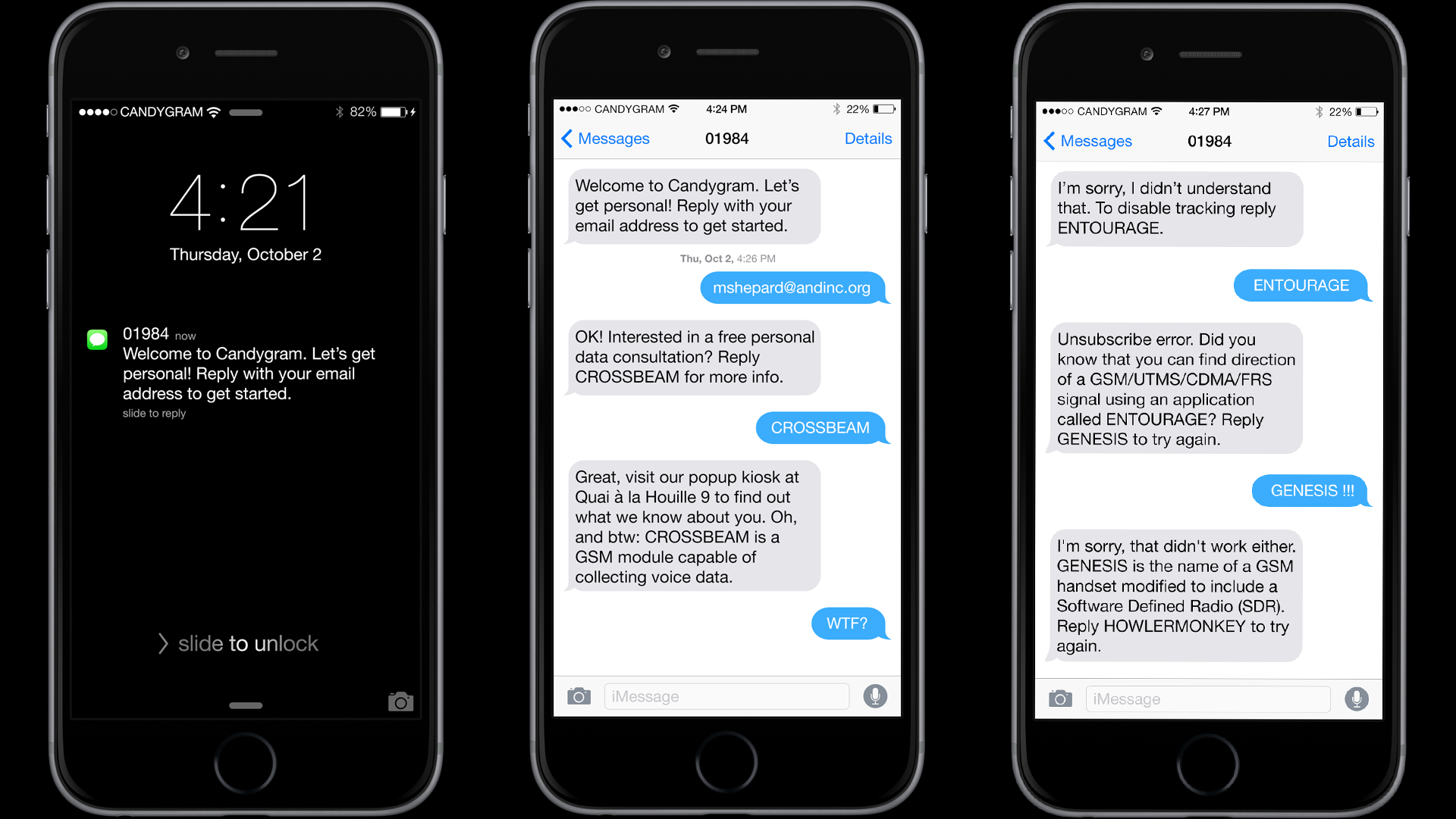 FALSE POSITIVE deploys text messaging, stealth infrastructure, street intervention, and data visualization to enact a surveillance conspiracy engaging the public in an intimate, techno-political conversation with the mobile technologies on which they depend.
